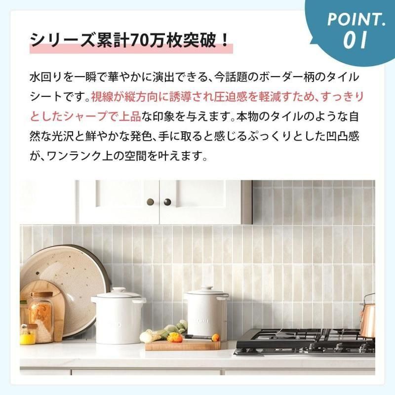 水回りを一瞬で華やかに演出できる、今話題のボーダー柄のタイルシートです。視線が縦方向に誘導されるため圧迫感を軽減する効果があり、すっきりとしたシャープで上品な印象を与えます。まるで本物のタイルのような自然な光沢と鮮やかな発色、手に取ると感じるぷっくりとした凹凸感が、ワンランク上の空間を叶えます。シール感がなく高級感たっぷり。水回りはもちろん、家具や雑貨のアクセントにもぴったりです。